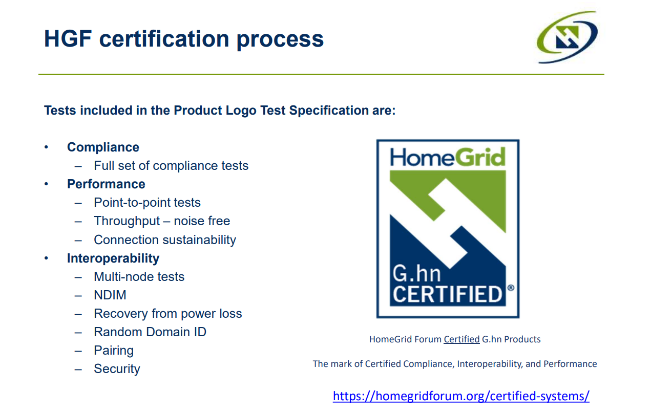 HomeGrid Certification ensures compliance and interoperability (C&I) of silicon and systems through plugfests and rigorous C&I testing. A logo is issued for certified systems’ packaging and documentation of G.hn-based systems. HGF Certification ensures that retail customers and Service Providers have confidence in, and great satisfaction with all HGF G.hn Certified Certified products.