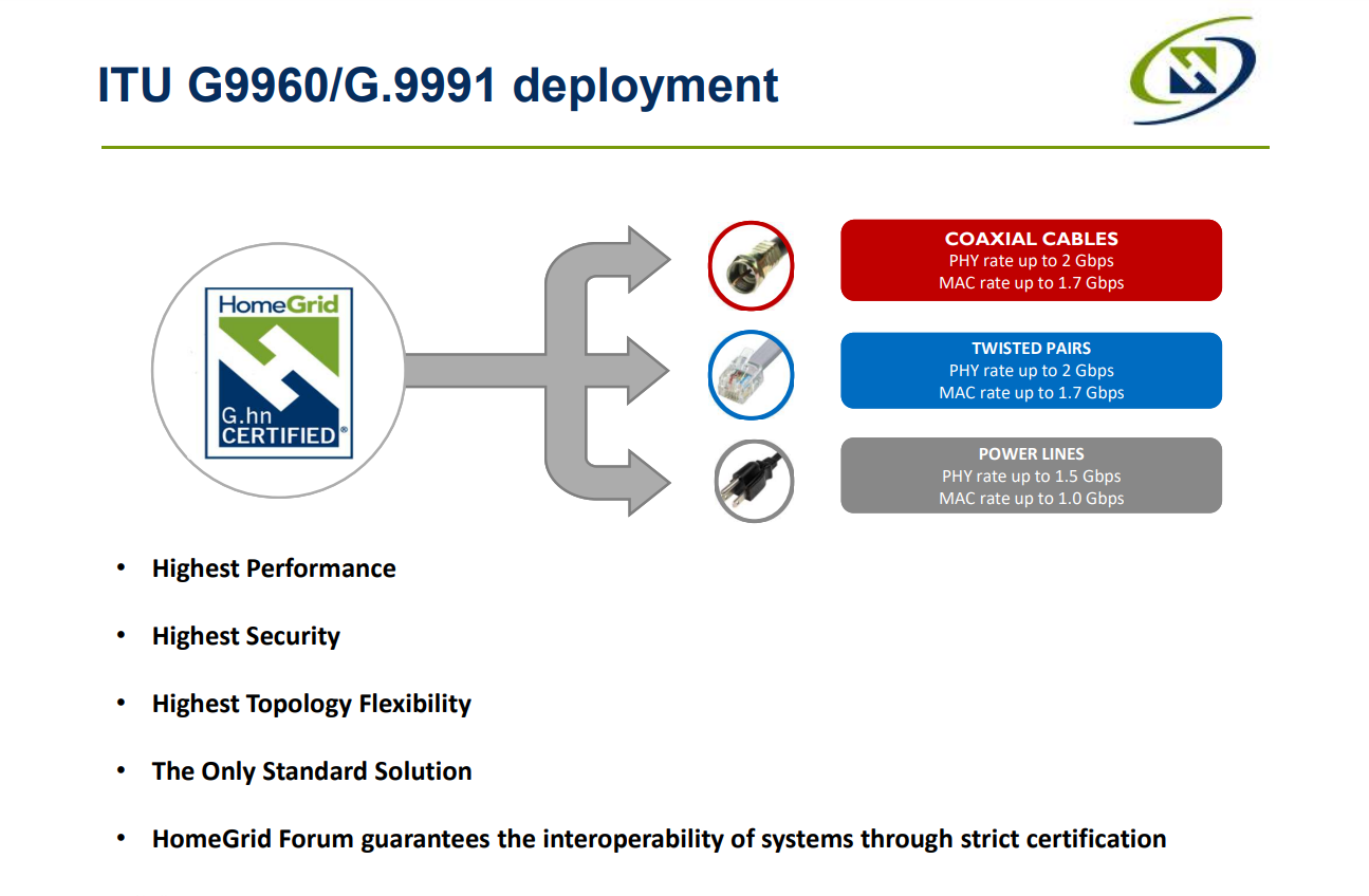 “Looking at the ecosystem and such, HomeGrid Forum has been created as an alliance to support the certification as we said to help ITU-T based standardisation ecosystem to advance very rapidly for certification. So, that comes with the highest performance we knew G.hn is a great technology for the wired backbone in terms of numbers here you have a very quick snapshot of what can provide so it started with a power line with the fire rate of 1.5 and the MAC rate of one one gigabit power line to note that is the most you know able to catch noise interference medium. So, if everything works on powerline, well then you can make sure on twisted pairs and actual pairs are going to work even beyond that highest speeds. So on boats, you do have a MAC of 1.7 gigabits and of course, that's because the fight it's two gigabits, it has the highest security Yes, 128. And topology flexibility will go in in detail Santos being the only standard solution. But again, I keep reinforcing the fact that this can only be deployed by and accelerated successfully for interoperability and certification.”