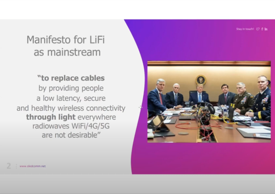 ”So, first of all, and before starting about this, I would like just to contribute to what my estimated colleagues have said about LIFI, the ecosystem and the LCA, what I realised during the last period is that at the end of the day, if I had there is one manifesto for the LIFI market as mainstream is we are here to replace cables at the end of the day. So, we are not here to compete with Wi-Fi, because I saw some questions about Wi-Fi being competitive in terms of price, we are here to offer an alternative to cables using light and everywhere the radio frequencies are not a solution, they are not desired sometimes they are not authorised sometimes in such an environment. So basically, to my opinion, LIFI is a niche market that a niche market for you know, in a huge market that is Wi-Fi, 4g, and 5g. And there are some spaces that are not covered with those technologies that we can cover as LIFI suppliers or as a LIFI ecosystem. So this is where I see and you know, these pictures show exactly. So I am not a Trump fan. But I think this picture is very nice because it shows the mess of tables inside a war room of the government. Because they are not authorised I guess to use Wi-Fi for security reasons in that environment. And if they would have used LIFI, it would get to the same latency, the same security as the cables with the convenience of having a wireless solution. So this is exactly where we could position our market as LIFI. So again, not to compete with radio frequencies, but to complement radio frequencies everywhere, the radio frequencies are not a solution. If we talk about the LIFI market, I think a lot of things have been said, I'm just mentioning here, a company called BIS research, a market research company, that shows that LIFI is an emerging market that that is obvious to everyone that the market would be of a size of $35 billion in 2028. It's very difficult to estimate. But let's say it's not a big market if you compare it to the radio frequency market, but you see that education is one of the main use cases that has been identified for the LIFI market and represent one of the big segments where the LIFI could have a real use case amongst close to healthcare and other aerospace we talked about, I will notice a few minutes ago.”