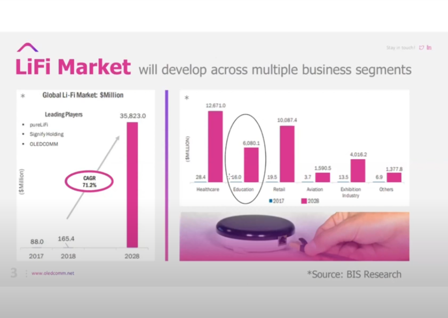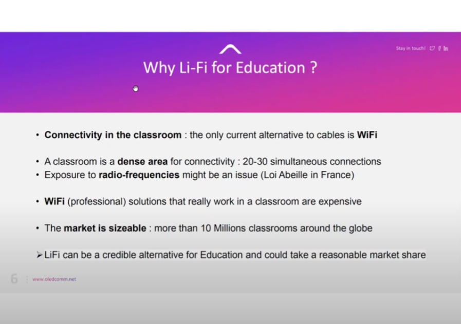 “First of all, I'm going to try to focus on one use case, even if LIFI has many, many possible use cases, which is education because it's at the heart of our experience at OLEDCOMM in the last 18 months. And I would like just to share with you what is my view on the subject”.