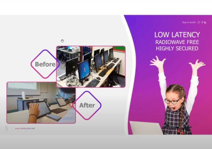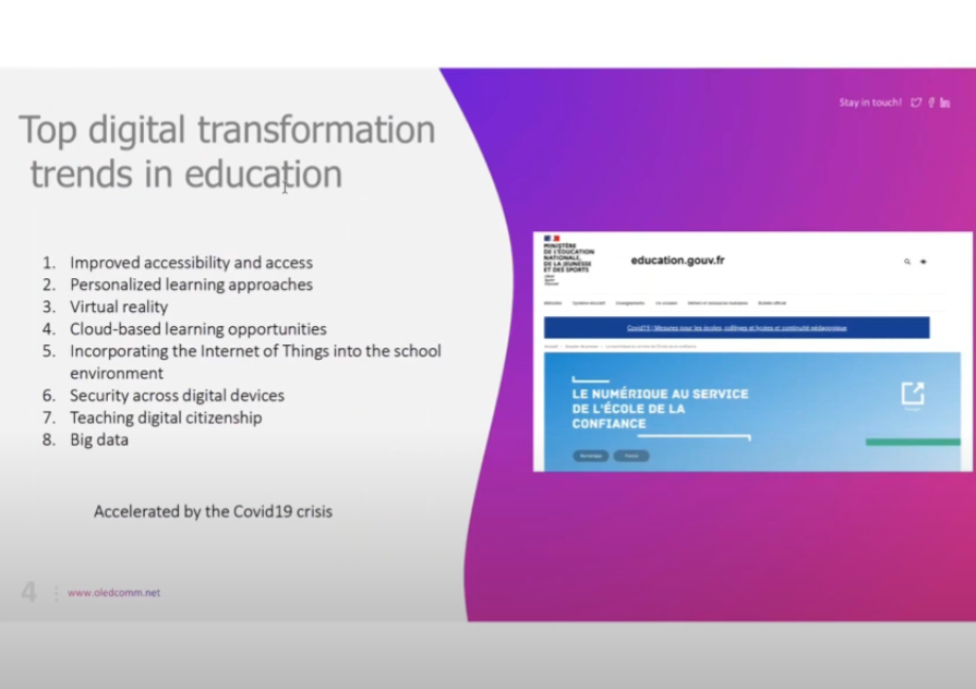 “So, that's why at least at OLEDCOMM, you know, we have decided to focus on it because we think that we should specialise in one or two verticals in order to be able to succeed with the risk of a company like for us is the strategic dispersion. So we have decided to focus on education as one of the main that's vertical that we have decided to focus on. So, what are the trends in education? So, first of all, if I have to mention some big trends in education, of course, digital transformation is something that is happening in some countries and is even mandatory. In France for instance, there are there is a programme called L' Ecole numerique and every school will have to equip its students, children, classrooms, with connectivity with tablets and with laptops.”