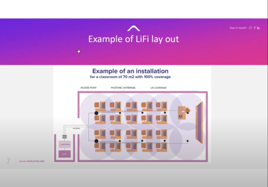 “The example that I would like to share with you is how to, for instance, we can propose to instal a classroom this is a typical classroom of 10 metres by seven metres with the width around can be a little bit poor with around nine 10 antennas or access points with the coverage that you see here being shown. We can cover reasonably a classroom. So basically it means that having the infrastructure on the ceiling we have now today not tomorrow today. And I'm not talking about OLEDCOMM, I'm talking about the product of our colleagues Signify, pureLiFi and Lucibel. Well, there are solutions to connect a classroom in an easy way. And in a reasonable from an economical point of view also. So, this is a concrete example that we had at OLEDCOMM that really works today.”