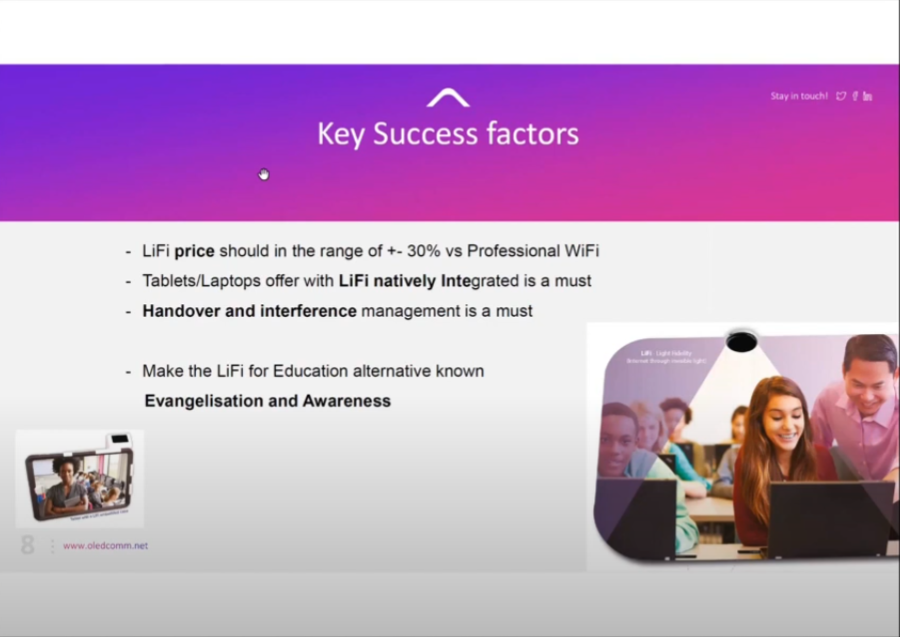 “The key success factor for LIFI in education to emerge, of course, is the price you are in an environment where I think this is my estimate that we should that LIFI total price should be in the range of plus or minus 30% versus professional Wi-Fi, to enable the How to say, early adopters, and then inflection point and move to the Wi-Fi, because then the benefits of the LIFI in terms of latency, in terms of comfort of connection, robustness, and we didn't talk about even security versus radiofrequency will have a big impact. So, professional LIFI is not an expensive though professional Wi-Fi 6 box is quite a price. And when a school is adopting your real connectivity series connectivity solution, then the price of LIFI could be reasonable, if it is plus or minus 30%. Versus the solutions today. The other key success factor is, of course, a laptop and tablets that need to be natively integrated, it's very difficult in this environment to have a dongle it's a very complicated our experience is that the professor will take will say hey guys, I will people will lose a dongle etc. So we need step by step to offer a solution to integrate the LIFI natively into tablets, into laptops or at least into cases to make it let's say to make the experience quite easy. And of course, some technical challenges because the classroom from a handover interference point of view is a very complex component. Not easy to do. So, from a technical point of view, we need to embed in order to have a solution that works with 20 to 30 people connecting at the same time in the same space to master completely do handover and reference management. And this is where the discussion we had earlier about how to embed those functionalities into the ITU G.VLC. IEEE 802.11bb is so important in the coming years and the role of the LCA is so important in the coming years to promote the solution and those functionalities. And again, at the end of the day, nothing is possible if we don't, if we are not able to make evangelization and awareness. Today, the people in all countries don't know they have an alternative to Wi-Fi. When they are moving to to to digitalize the schools, the only solution today is Wi-Fi. And we need to make sure they're at least aware that alternative to radiofrequency existing data in those environments, and that there is an alternative that could be let's say from a price point of view reasonable, and that is accessible to everyone. So, so creating awareness is absolute machinery to make the LIFI for educational success”.