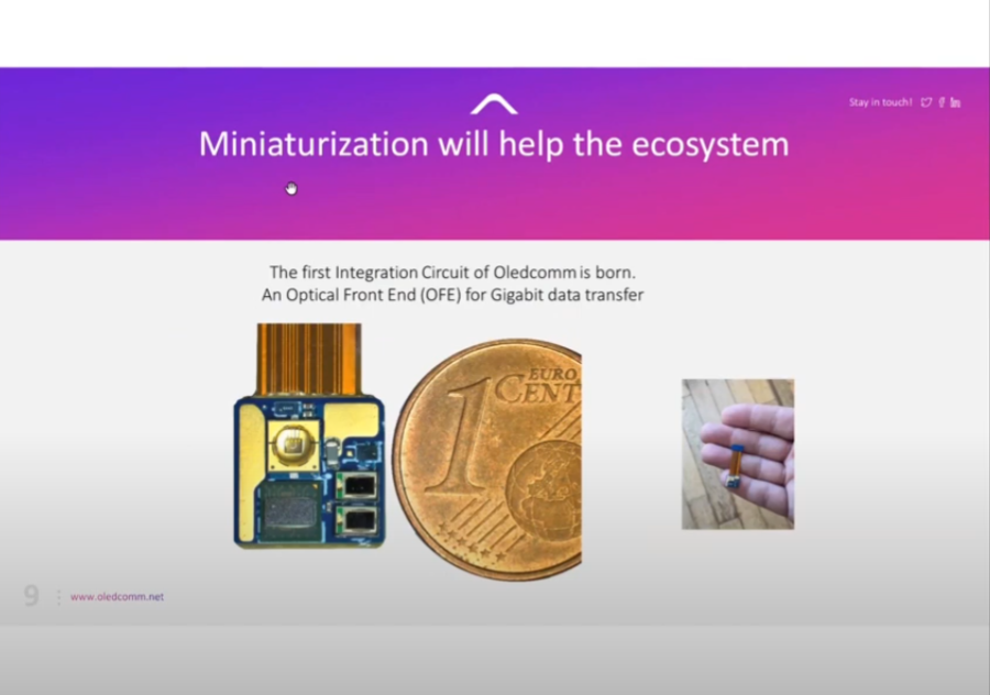 “I want to finish my presentation by announcing that we'll be making a few days at the Mobile World Congress in Barcelona because all that is going to contribute to the ecosystem of the LIFI, we're not the only one our colleagues have, at least to my understanding our colleagues of pureLiFi has also announced last year, the first chipset that is completely integrated to enable LIFI integration to mobile devices. It's our turn now to announce the first integrated circuit of OLEDCOMM, this is a picture this is a real picture of an optical front end that is made of maybe recognise it has a vaxon of two photodiodes and the grey chipset that you see on the picture is the new gigabit chipset of OLEDCOMM. And you see the size but with this size, with this compactness, there is a new word that is coming for integration of the LIFI into laptops into tablets for education also into mobile devices into IoT and into all kinds of possible use cases are coming in the coming years. Thank you very much”.