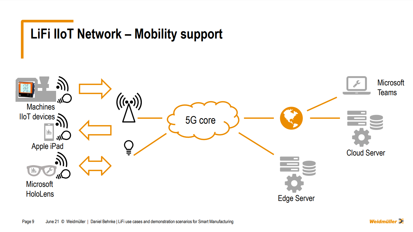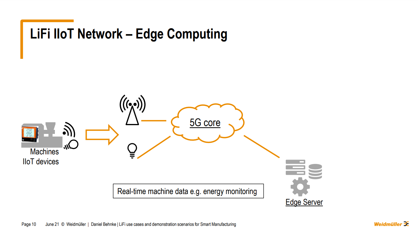 “What we are also examining and Elliott is the mobility support with the integration of LIFI into the 5g core. There, we are working together on the phone over-focus. And there were talking about different use cases, integration of more devices. I want to stress that a little bit more on some detailed slides. So first of all, as I've mentioned before, we want to directly interconnect the machines, we can do that either via LIFI or via 5g and maybe have some kind of edge server cluster onto the machines for real-time and machine data analysis”.