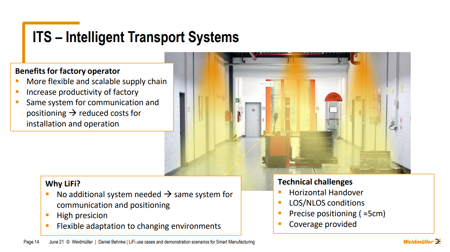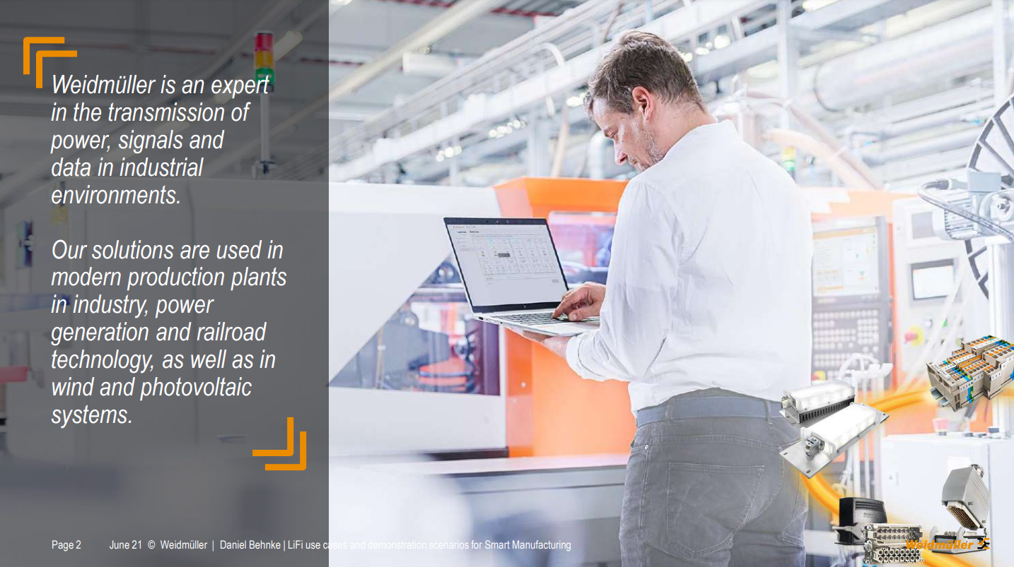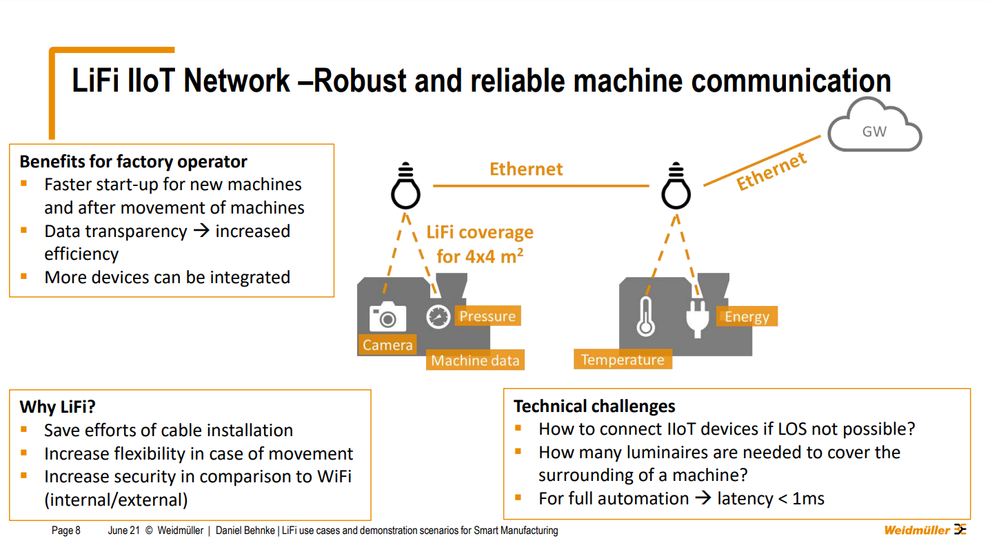 “To get in touch with LIFI technologies, we are in the lucky situation that we are part of the EU Horizon 2020 project named ELIOT, where we can evaluate the use of LIFI by communication for smart manufacturing for us. What we are doing in this project is on the first-hand where I've been talking a lot about potential use cases. I will talk about that on the next slides. And we want to set up demonstration cases, to see how the technology works firsthand. We want to see them working in our factories and our production sites. And yeah, that's what we want to do our daily activities. Our main questions are, for example, is there sufficient coverage for all our machines? How many luminaires do we need at the end? Is the reliability better than Wi-Fi provides for us, we all know Wi-Fi peripheral technology but has some flaws at some times. But also we have to keep in mind the costs from for the different technologies. So for example, we are using Wi-Fi, you will see that on the next slides. Also, another factor is at the moment and working environment. But we see some issues over there. And the question for us is will LIFI be a benefit for us keeping costs and performance in mind. And also what are some very interesting topic, for the whole industry, our 5g campus networks, we are also involved in another 5g research project where we want to evaluate exactly the use of 5g over there. What's also very interesting and important for us at the end to evaluate the different technologies and our Setup and Maintenance efforts. So what we want to see not just what the investors want but also what are the costs forum for the next year's forum. Unfortunately, we wanted to be more at the demonstration phase at the moment but due to COVID-19, we weren't able to have any visitors and our production sites in the last month. So we couldn't set up the demonstrator, we will do that now in the fall. And at the moment we see the end of this project and of the year. Maybe it changes a little bit”.