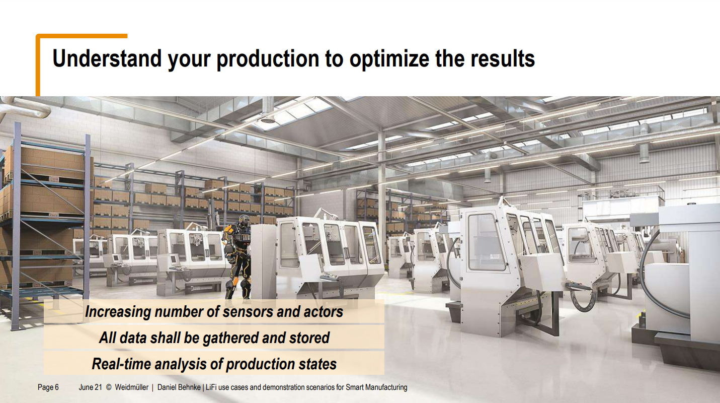 “So, why we are talking about different communication technologies. So, it's not that might be not that obvious, why we have some factory IT dealing with production sites here directly involved and also research regarding LIFI communications. So, in general generally what drives us is we want to increase of course, wearability and productivity of all our production sites, we want to increase the process efficiency and yield and also, we want to have better efficiency regarding energy and resources. resources, for example, at the moment is a very huge topic at our company. As maybe some of you are also experiencing at the moment that resources are very limited. And we have issues to continue our production at some times. And all of that lead source to a situation where we are talking about new IT technologies. For example, we want to integrate industrial IoT sensors, and things like that, and are also talking about automation many, many times where we also need communication technology. But in general and important aspect, stressing that many many times also in our research projects. For us communication technology is a servant, that's not a driver. So we are very open-minded regarding all communication technologies and want to see what fits the most for us.”
