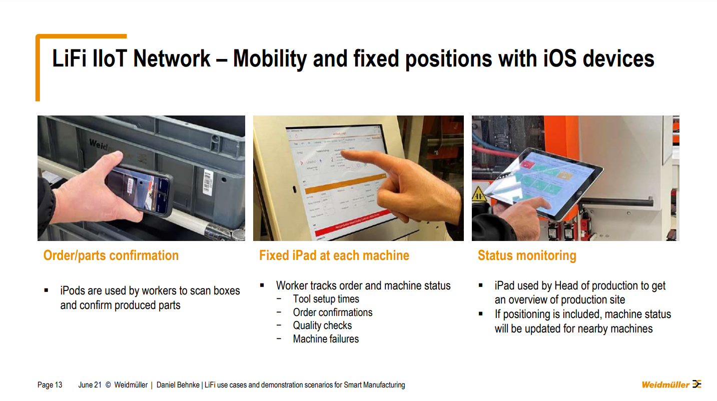 “I want to show you some pictures. So, you get a better impression of what we foresee as use cases. For example, here for the iOS devices also from a mobility perspective, there were, for example, the icons, which we are using for confirmation of production parts. In the demonstration scenario for ELIOT, we will integrate those devices via 5g because they are we have mobility support everywhere and the factory. And we have also foreseen switching to the iPad. And data offloading scenario when we are close to our machine where we have a LIFI link available, then we can hand over the communication from 5g to LIFI to get some more information. But also we are using mobile devices such as an iPad on fixed positions, for example, here at the machine where we are doing all the different aspects regarding our manufacturing execution system. So, set output times will be monitored over there as well as order confirmations as well. quality checks, things like that. And for that LIFI integration would be very helpful for us because these iPads are at the moment connected via Wi-Fi. And, and generally, it's working, but it's working, I would say 95% and we want to have it somewhere above 99% of the time. But also you can see here in challenging environments because of course we have to keep the iPads in a robust case. So also there. That would be an interesting aspect of our discussions”.
