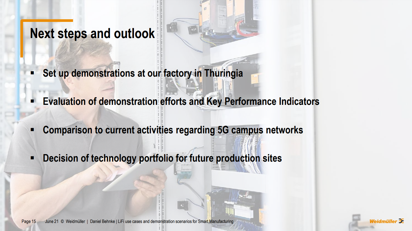 “With that, I want to conclude my tour. Unfortunately, I am not able to show you any results at the moment, because we are not in the phase where we could have set up the demonstrations. We will do that in the upcoming month and maybe end of this year or startup next year. We also have some results regarding our use cases. So our next steps are, we want to set up the demonstrations. And then we want to compare the technology, for example, adding 5g campus net networks. So at the end of the project, ELIOT, that will be the decision for us. And that's our aim and our goal. If LIFI is interesting technology and will be also part of our future strategy regarding future production sites, or why Wi-Fi and 5g are the benefits for us and we will focus on that communication technologies”.